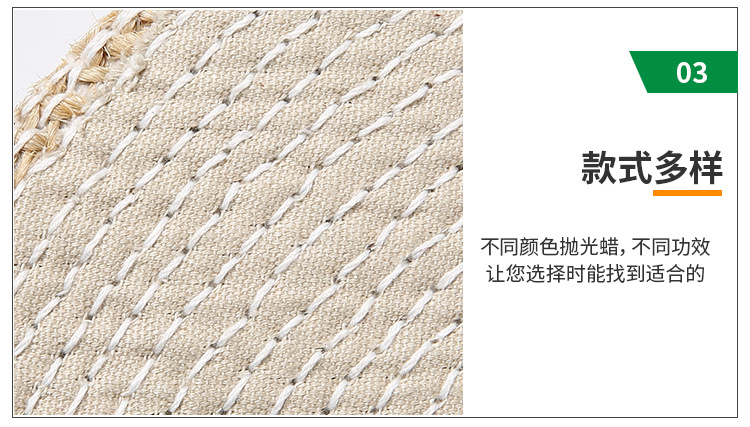 麻轆:可分為油麻轆和布麻轆。麻轆采用優(yōu)良劍麻為原材料,經(jīng)再三深加工布成為一種堅硬的拋光材料,油麻轆主要用于不銹鋼制品自動拋光生線,布麻轆通常用于拋金屬制品,種類齊全,規(guī)格有直徑50mm——500mm不等